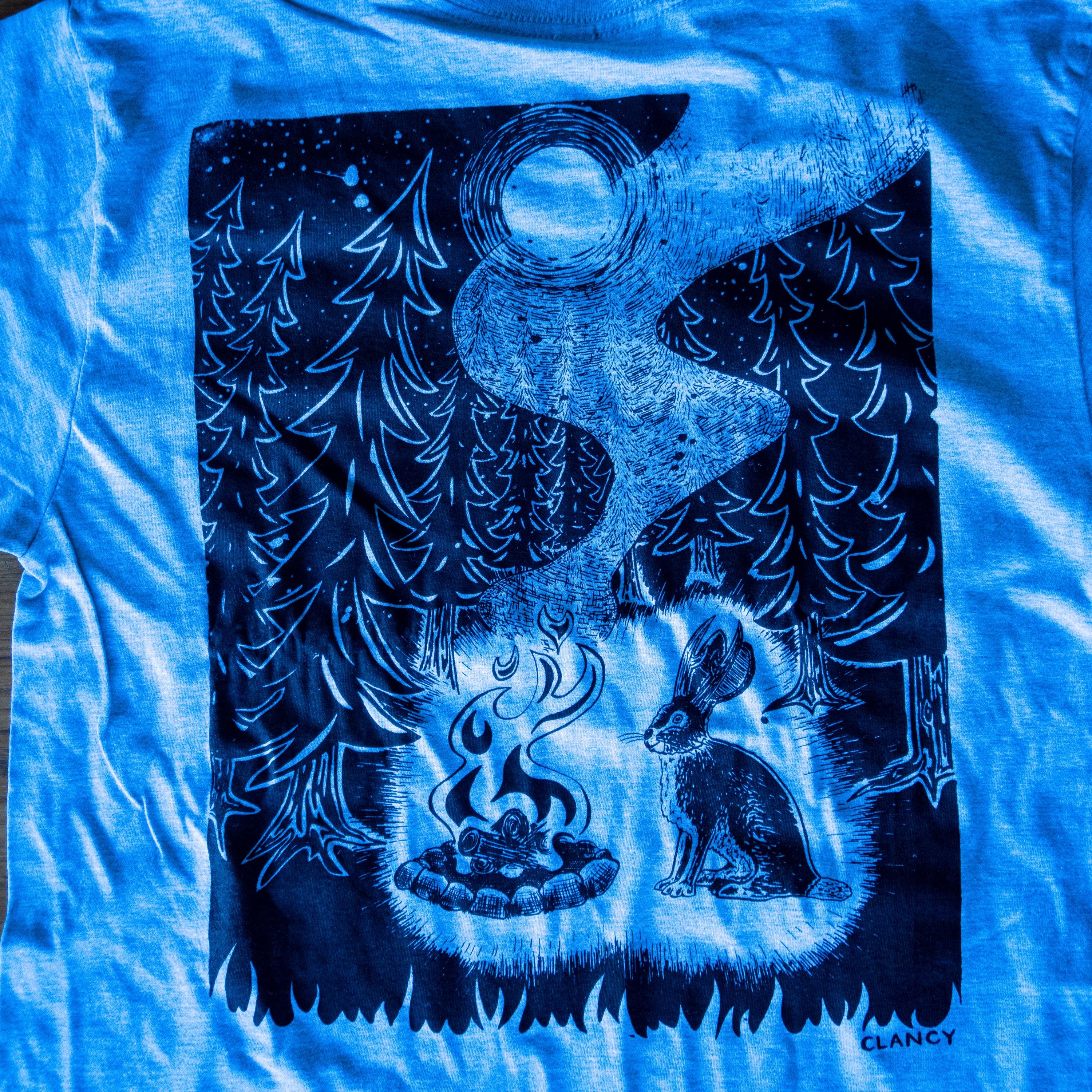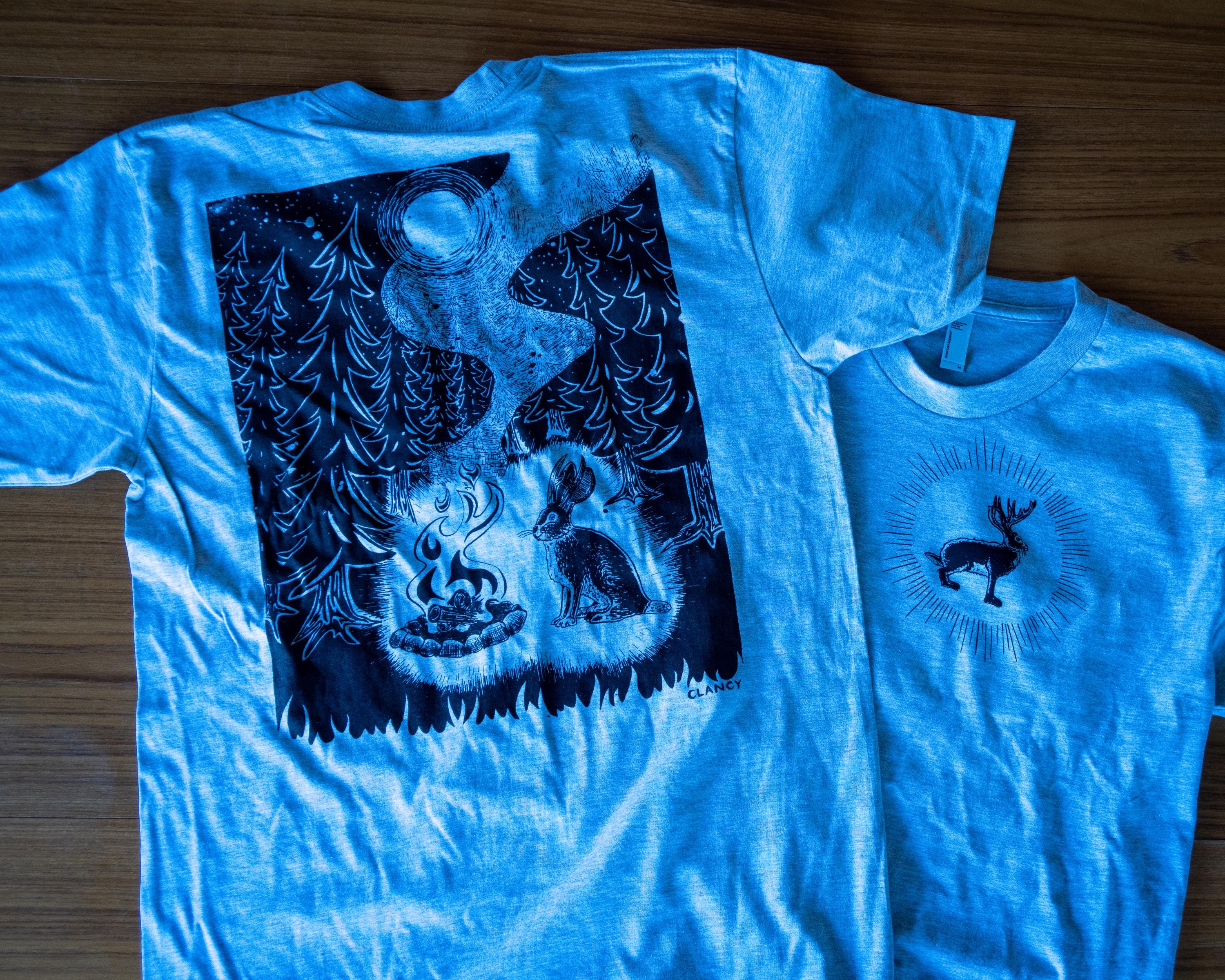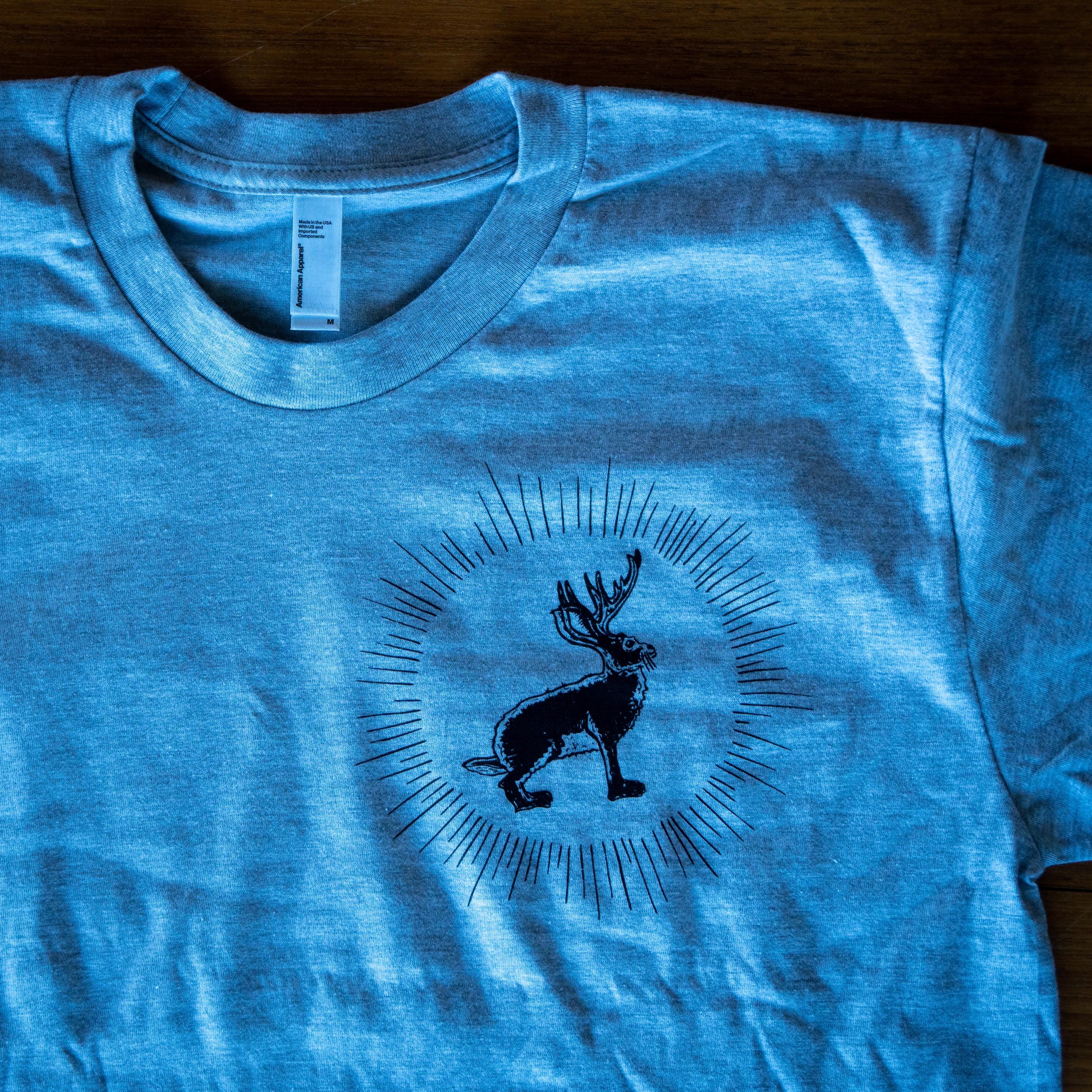 Jackalope in the Pine Tree Forest Back Print, Jackalope Sunburst Chest Print